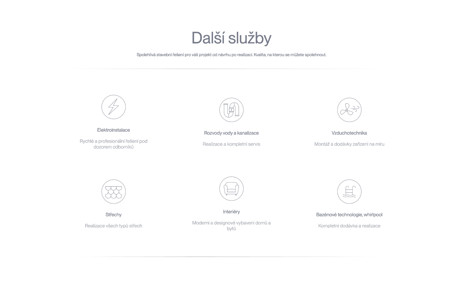Zároveň jsme každou podstránku i určité sekce zpestřili tématickým copywritingem a jednoduchými piktogramy se stavební tématikou s tenkými liniemi připomínající kreslené stavební projektové plány.