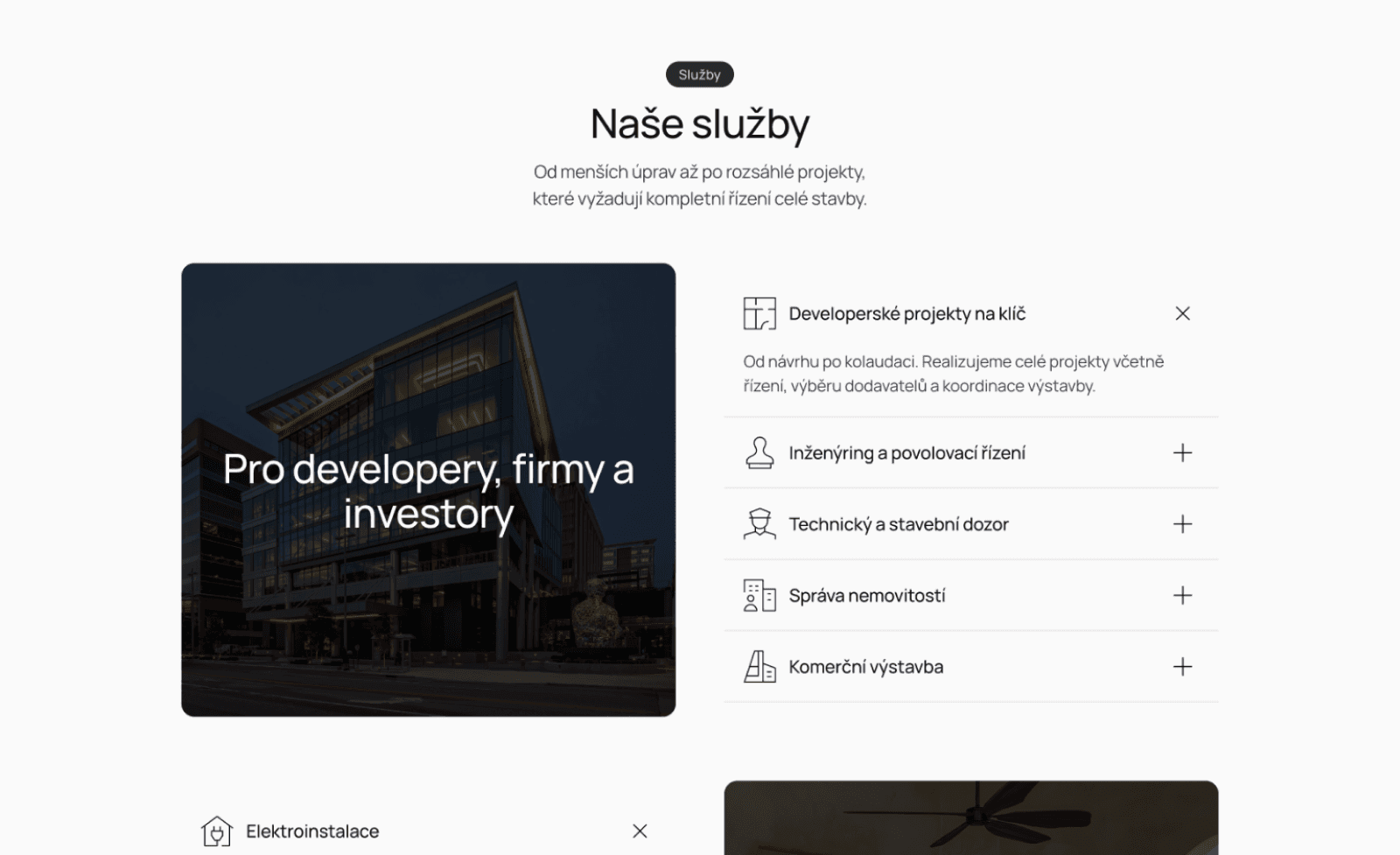 Firma totiž nabízí služby od malých úprav nemovitosti až po kompletní výstavbu, a to jak pro B2C zákazníky, tak pro developery, firmy a investory.