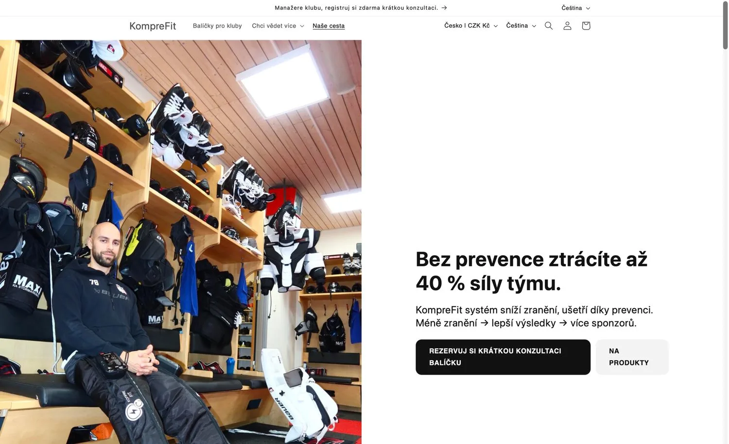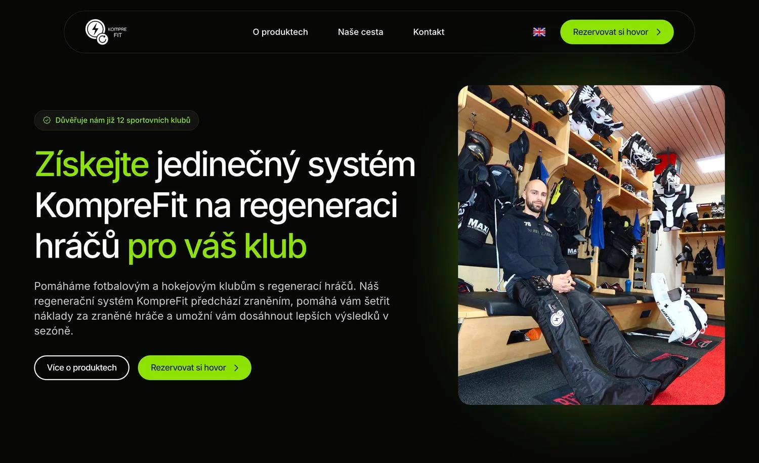Vytvořili jsme tedy novou úvodní sekci, která jasně buduje důvěru na první pohled, vysvětluje, čemu se KompreFit věnuje, mluví přímo ke klubům a vede návštěvníka k rezervaci hovoru.